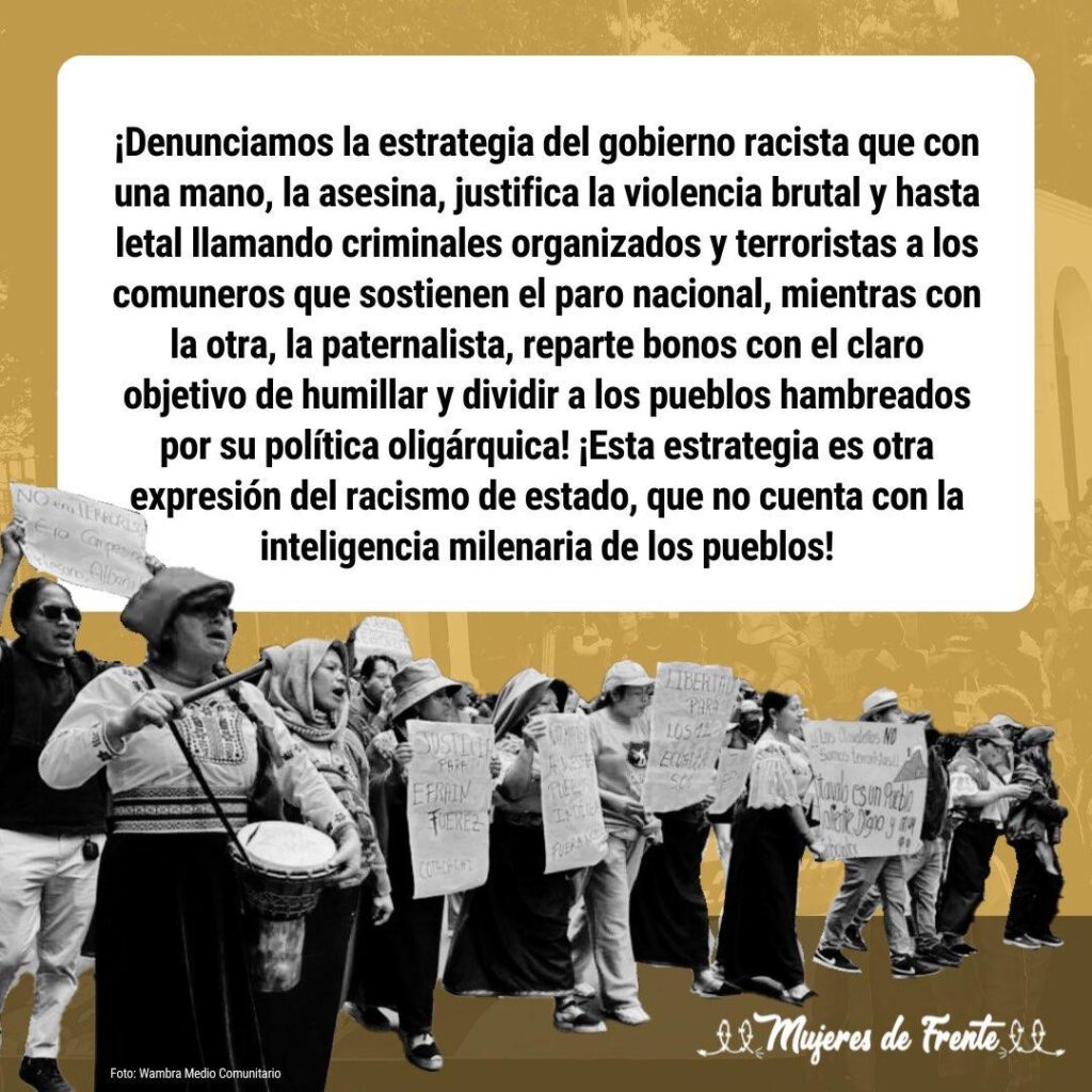 Por lo tanto, hay una legitimación de la detención de los manifestantes en estas prisiones, e incluso, del asesinato de Efraín. Del asesinato el gobierno no ha dicho nada, pero lo que sí queda claro es que Imababura ha sido sistemáticamente criminalizada. Con esto trato de decir que las cárceles en este país son un lugar clave de la estrategia de puesta en guerra, de generación de terror y de reclutamiento de hombres para la guerra. Por eso, para nosotras, nuestra perspectiva no puede ser solamente antirracista, tiene que ser radicalmente feminista. Hay masculinidades mafiosas que están produciéndose desde dentro de las prisiones. Aunque no está directamente relacionada con el paro, quisiera añadir que desde enero de 2024, con la militarización de las prisiones, se institucionaliza la tortura sostenida sobre la población penitenciaria. Que son, en su inmensa mayoría, por supuesto, varones jóvenes racializados. Por supuesto son también empobrecidos, porque clase y raza en este país no se pueden distinguir, tienen que pensarse juntas. Y nosotras hemos venido pensando qué implica, en términos de producción del mundo emocional, la tortura sistemática. Si vos quieres sicarios, tienes que tener varones rotos, tienes que tener hombres insensibles. Tienes que tener hombres capaces de matar y morir. Tienes que tener hombres capaces de resistir y de dar violencia cruenta.