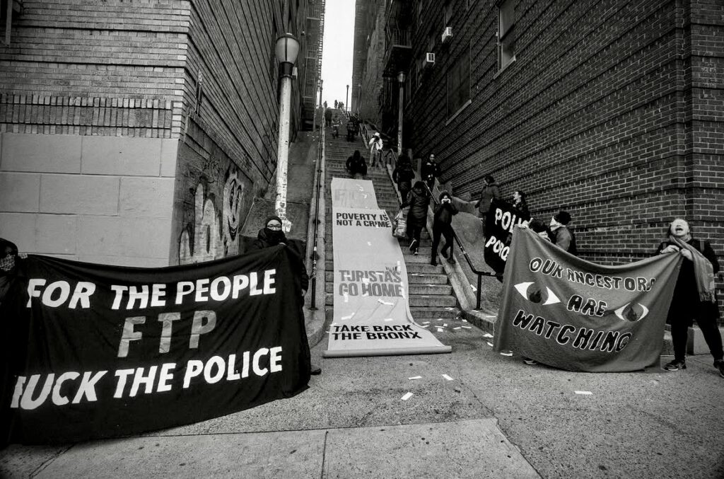 Por otro lado, la memoria de los movimientos mismos es muy fragmentaria. Lo que pasó hace cuatro años ya no se recuerda hoy, quién o cómo se hicieron las cosas en la lucha no se recuerda hoy. No hay un lugar en donde depositar todo lo que hemos hecho y a donde se puede acudir para conocer y saber cómo hicieron, qué hicieron. Por ejemplo, aquí en el Bronx en 2018, tuvimos una lucha contra los inversores que querían construir, lo que iba a generar una rezonificación del barrio y un cambio en el precio de los alquileres. Nosotros luchamos contra este proceso para parar ese cambio que quería abrir una área entera en el sur del Bronx para inversores, y logramos ganar esa lucha. Al mismo tiempo estábamos con la lucha FTP (for the people, fuck the police, fight the power, fuck the prisions, free the people) y también perdimos el centro comunitario que teníamos. Pasaron muchas cosas en ese año.